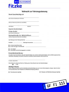 Vollmacht zur Fahrzeugzulassung. Mit diesem Formular bestätigen Sie, dass wir Ihr Fahrzeug in Ihrem Namen zulassen dürfen.